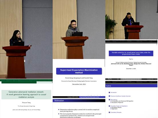 开幕式后,三位知名统计学领域专家学者带来了精彩的学术报告。香港中文大学宋心远教授以题目为“Generative adversarial mediation network: A novel generative learning approach to causal mediation analysis”的报告开启了本次研讨会的学术研讨环节。随后,首都经济贸易大学的李鲲鹏教授、首都师范大学胡涛教授分别作题为“Supervised Expectation-Maximization method”以及 “Variable selection for mixed panel count data under the proportional mean model” 的报告,新颖的视角和扎实的理论获得了参会学者的一致好评,带动了会场热烈的讨论氛围,与会代表纷纷表示收益良多。