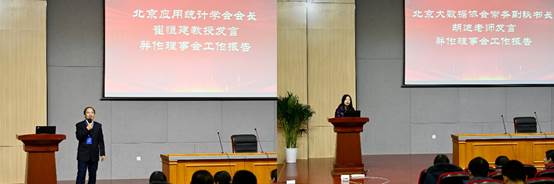 北京应用统计学会会长崔恒建教授致辞,对参会学者表示热烈的欢迎,对在筹办此次会议中付出巨大努力的k1体育统计与k1体育及相关部门教职工,为学会、协会逐渐壮大作出贡献的会员代表,给予学会、协会发展大力支持的各兄弟学会以及本次会议的报告人和主持人表示了衷心的感谢,并对北京应用统计学会和北京大数据协会今后的发展表达了美好的愿景。崔恒建教授回顾了“两会”成立的渊源和近年来的发展历程并作北京应用统计学会理事会工作报告,从会议举办情况、人才培养情况、培训开展情况和财务情况几个方面梳理了北京应用统计学会2023年的主要工作。随后,北京大数据协会常务副秘书长胡迪老师作北京大数据协会理事会工作报告,以工作简报形式总结协会及下属各专委会竞赛举办和工作开展和组织完善情况。