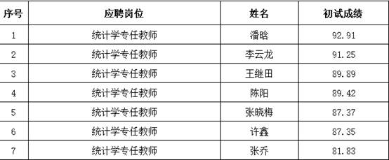 根据《k1体育2024公开招聘(第一批)公告》,统计与k1体育专任教师岗位初试采取学术水平及教学能力专项考核、综合面试考核的形式,成绩计算方法为:学术水平及教学能力专项考核成绩占80%、综合面试考核分值占比20%。现将初试成绩予以公布。成绩如下: